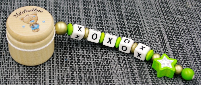 Unsere Milchzähne Döschen - Glitzer Stern "XOXOX" individuell mit Ihrem Wunschnamen. Milchzahn oder Locken Döschen sind das perfekte Geschenk für Ihren kleinen Liebling. In der handgefertigten Holzdose können die ersten Löckchen, oder bei den Größeren schon erste Milchzähne aufbewahrt werden. So bekommt das Döschen eine ganz besondere Bedeutung und erinnert auch später noch an wertvolle Momente mit Ihrem Liebling. Die Milchzahndöschen sind mit einem liebevollen Motiv verziert, zum Beispiel Teddys, Mäuse oder Marienkäfer u.v.m. Unsere Locken-/ Milchzahndöschen mit Namen, wie alle unsere Artikel, nach strengen Richtlinien hergestellt. So können Sie sich bei den Milchzahndöschen auf ein garantiert sicheres und schadstofffreies Produkt verlassen. Sollten Sie fragen oder Sonderwünsche zum Produkt haben, können Sie uns gerne (Bitte vor dem Kauf) kontaktieren. Zahlen, Umlaute & Sonderzeichen sind leider nicht möglich. Bitte lesen und beachten Sie vor dem Kauf unsere Sicherheits-/ Pflegehinweise, diese finden Sie oben im Raster unter Sicherheits-/ Pflegehinweise, ebenfalls werden diese jeder Bestellung beigelegt.