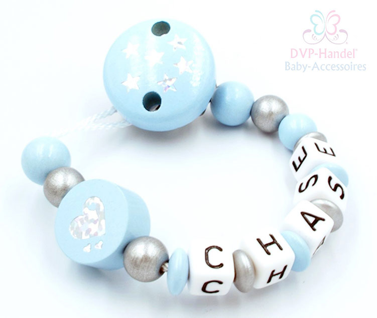 Diese liebevoll in handgefertigte Schnullerkette mit Namen - Glitzer Sterne "Chase" ist der perfekte Wegbegleiter, mit dem Wunschnamen Ihres Babys. die Schnullerkette ist praktisch, hilfreich und individuell. Schnullerketten werden mit einem Clip am Strampler, Pullover oder Co. befestigt und mit dem Nuckel verbunden – schon kann nichts mehr schiefgehen. Sollte die Schnullerkette vor Staunen aus dem Mund fallen, bleibt es an der Kette hängen. Die Zeiten, in denen die Eltern oder Großeltern hastig nach dem Schnuller suchen mussten, sind vorbei. Der Wunschname machen die Schnullerkette einzigartig und zu einem echten Unikat, zudem ist die Schnullerkette mit Namen ein sehr schönes Geschenk zur Geburt, Taufe oder Baby-Party. Selbstverständlich können Sie bei unserer Schnullerkette mit Namen auf ein sicheres und schadstofffreies Produkt für Ihr Baby vertrauen wir befolgen strengste Richtlinien der DIN EN.